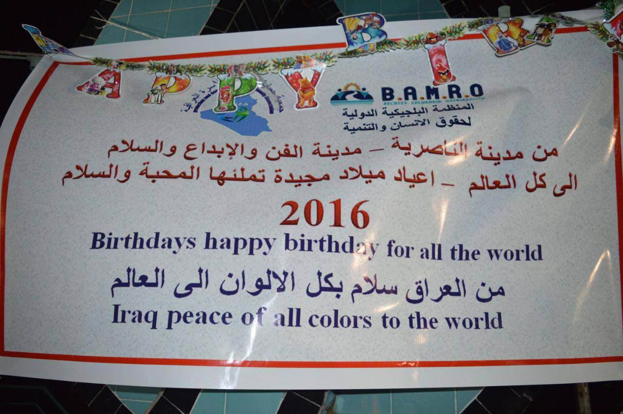بحضور وإشراف الناشط الحقوقي العراقي الاستاذ حقي كريم هادي رئيس جمعية حماية وتطوير الاسرة العراقية والمنظمة البلجيكية الدولية لحقوق الانسان والتنمية حفلا كبيرا تنمويا احتفالا بالعام الجديد في محافظة الناصرية العراقية ونتقدم بالشكر والعرفان والامتنان لكل من شارك وساهم معنا في احياء حفل اعياد الميلاد المجيد 2016 على ساحة ملتقى المحبة في الناصرية الذي شارك فيه من جميع الأديان والطوائف والأقليات في العراق ونتقدم بكل الشكر والتقدير الى مديرية شرطة محافظة ذي قار على جهودهم الكبيرة بتوفير الحماية اللازمة للحفل وكل الشكر والثناء والامتنان لجميع وسائل الإعلام التي ساهمت في تغطية الحدث خصوصا قناة البغدادية الفضائية التي شاركتنا احتفالنا وبثه مباشرة .. . كل عام وانتم بألف خير وعام سعيد على العراق الجميل بكل طوائفه وجميع بلدان العالم من اجل نشر رسالة السلام من العراق الى العالم .